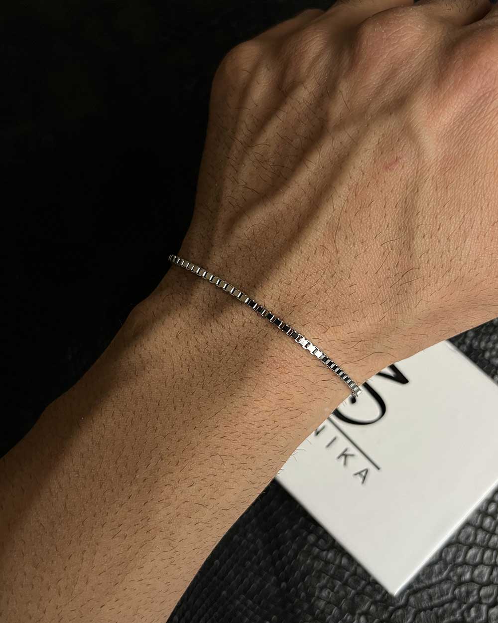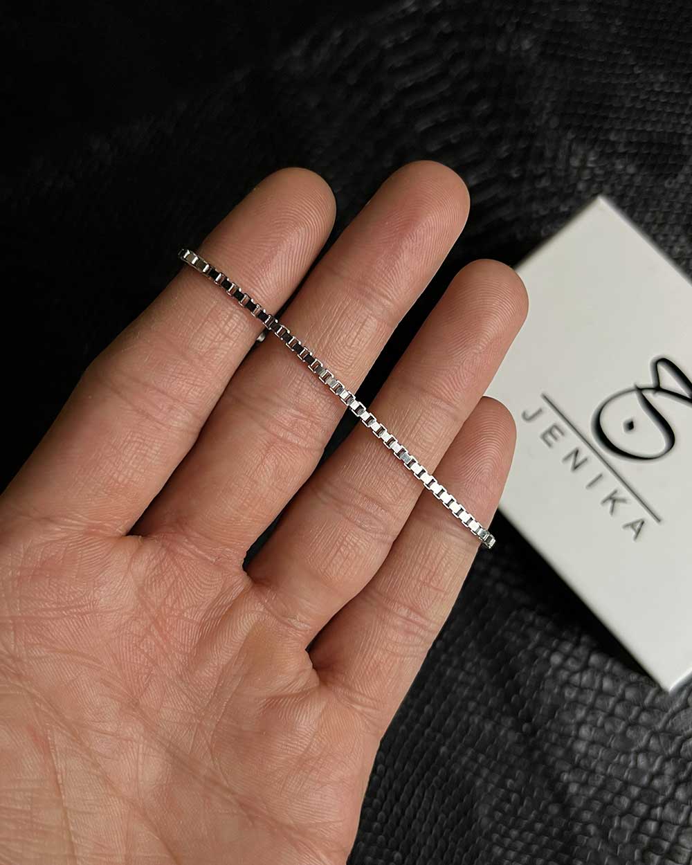 دستبند نقره مردانه مدل ونیزی ظریف جنیکا یک انتخاب فوقالعاده برای آقایانیه که عاشق اکسسوریهای مینیمال، خوشساخت و متفاوت هستن. طراحی مکعبی و منظم این مدل، یه درخشش خاص و چشمنواز روی دست ایجاد میکنه که بهراحتی با هر استایلی ست میشه؛ چه استایل اسپرت داشته باشی چه کلاسیک. این دستبند از نقره با عیار ۹۲۵ ساخته شده تا هم ماندگاری بالایی داشته باشه و هم در برابر تیرگی و حساسیت مقاوم باشه. وزن سبک و نشستن راحتش روی دست باعث میشه بدون هیچ اذیتی برای استفاده روزمره مناسب باشه.